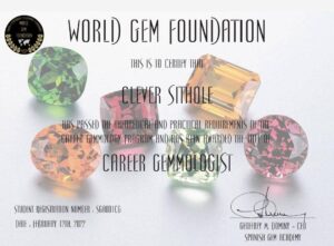 Zimbabwean engineer Clever Sithole was capped as the first Career Gemmologist from Africa. He studied with the World Gem Foundation after obtaining two scholarship fundings from the Tino Hammid Memorial Gemmological Scholarship Foundation and the W. E Hunn Memmorial Gemmological Scholarship Foundation. Eng Sithole completed his studies in Spain where he completed training at the Spanish Gem Academy to become the first career gemmologist in Africa including the Diamonds & Coloured Stones professional endorsement from the same institution.